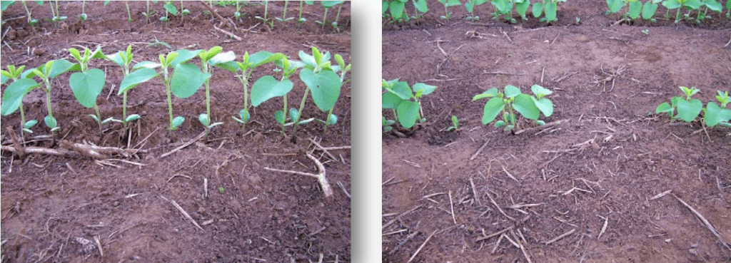 Imagem: À esquerda: semeadura de soja com sementes de alta qualidade e vigor: plântulas com emergência uniforme, bem espaçadas e sem falhas; à direita: resultado de sementes de baixa qualidade, resultando em falhas e aglomerados de plântulas. Fotos: Roberto Kazuhiko Zito.