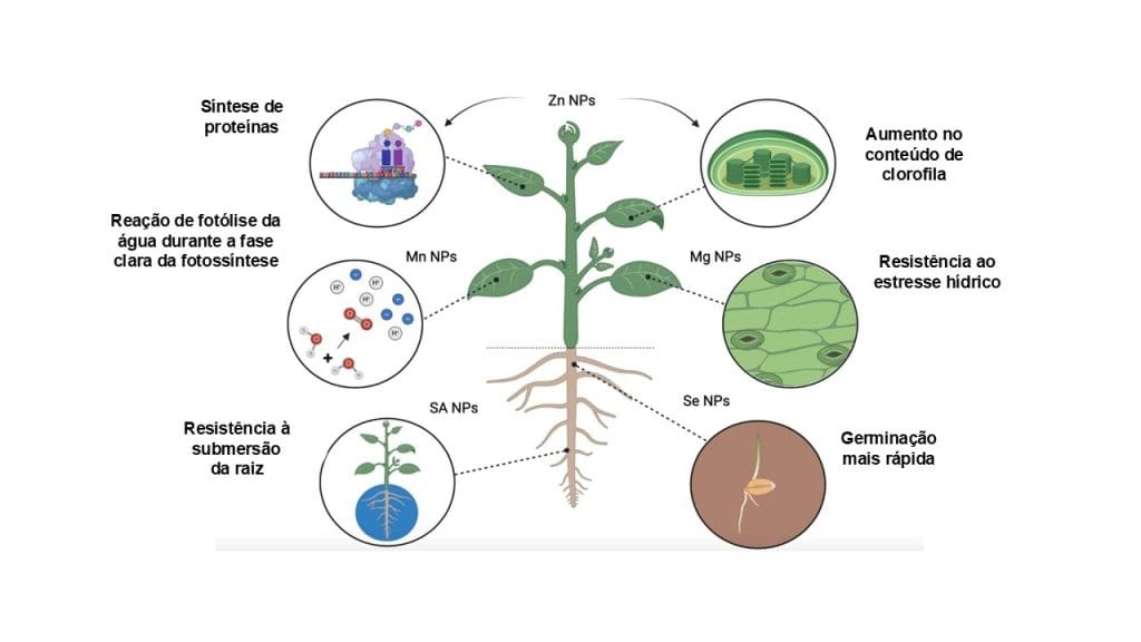 Estudos recentes indicam que Óxido de Zinco (ZnO), Óxido de Ferro (Fe₃O₄), Dióxido de Titânio (TiO₂) e Dióxido de Cério (CeO₂) em escala nanométrica podem melhorar a fotossíntese, aumentar o teor de clorofila, estimular o crescimento radicular e reduzir o estresse salino e hídrico em culturas como soja (Glycine max), arroz (Oryza sativa), trigo (Triticum aestivum) e canola (Brassica napus).