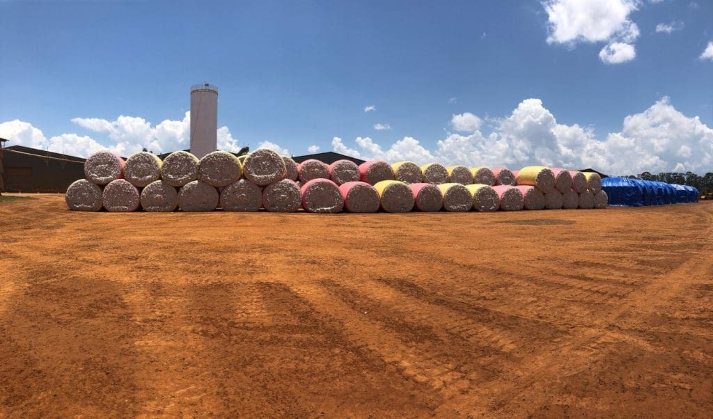 Imagem: fardos de algodão no pátio da algodoeira em Chapadão do Sul – MS. Foto: João Paulo Marim Sebim.