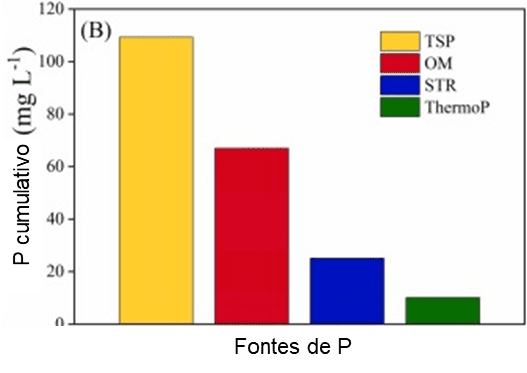 Imagem: conteúdo cumulativo de P no efluente de colunas de solo enriquecido com superfosfato triplo (TSP), organomineral (OM), estruvita (STR) e termofosfato (ThermoP). Fonte: Pessoa et al. (2025).