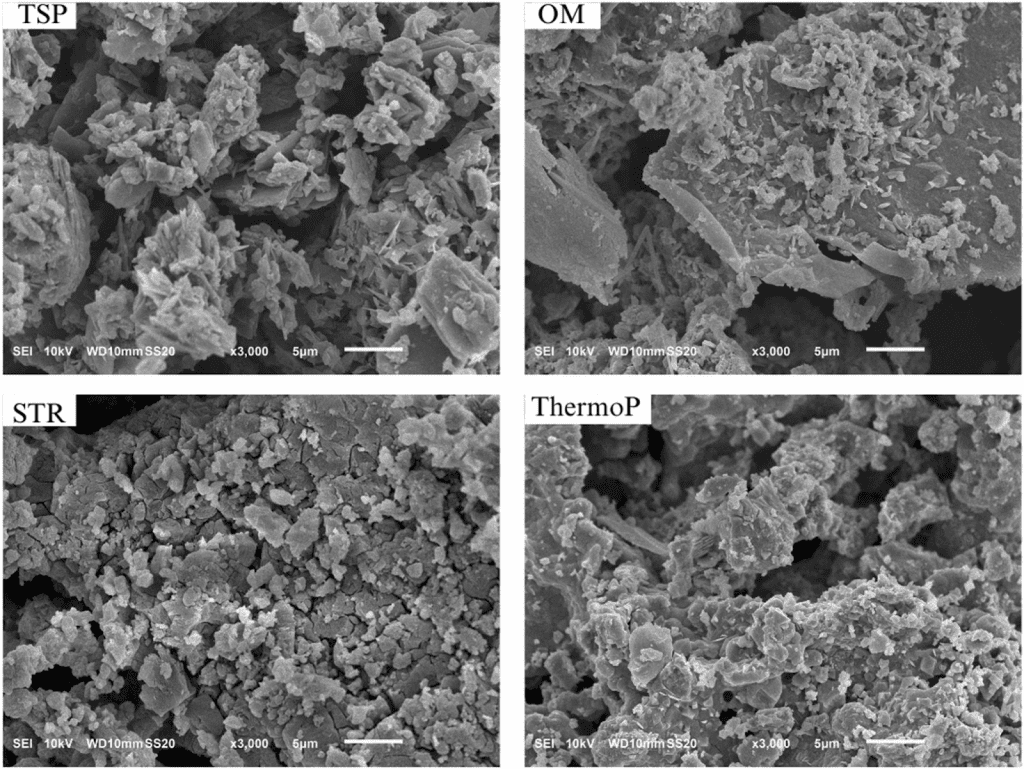 Imagem: Microscopia Eletrônica de Varredura (MEV) mostrando as microestruturas de superfície de fontes de fertilizantes fosfatados: superfosfato triplo (TSP), organomineral (OM), estruvita (STR) e termofosfato (ThermoP). Fonte: Pessoa et al. (2025).
