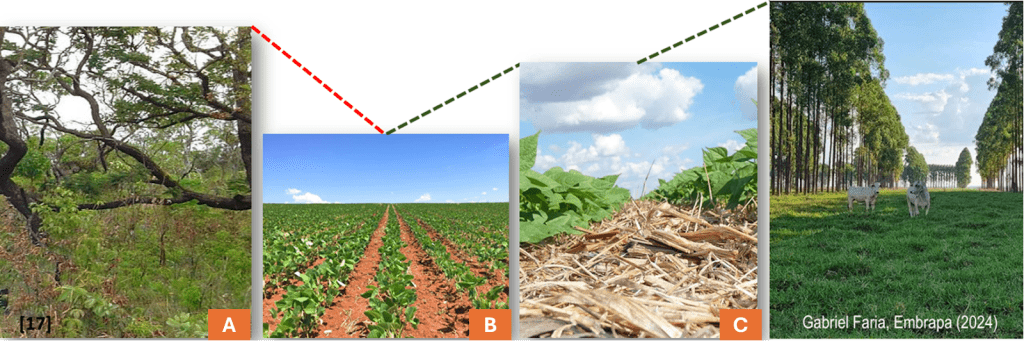 Imagem: Cerrado, agricultura de lavração, agricultura conservacionista e iLPF. Fonte: José Laércio Favarin (A, B e C).