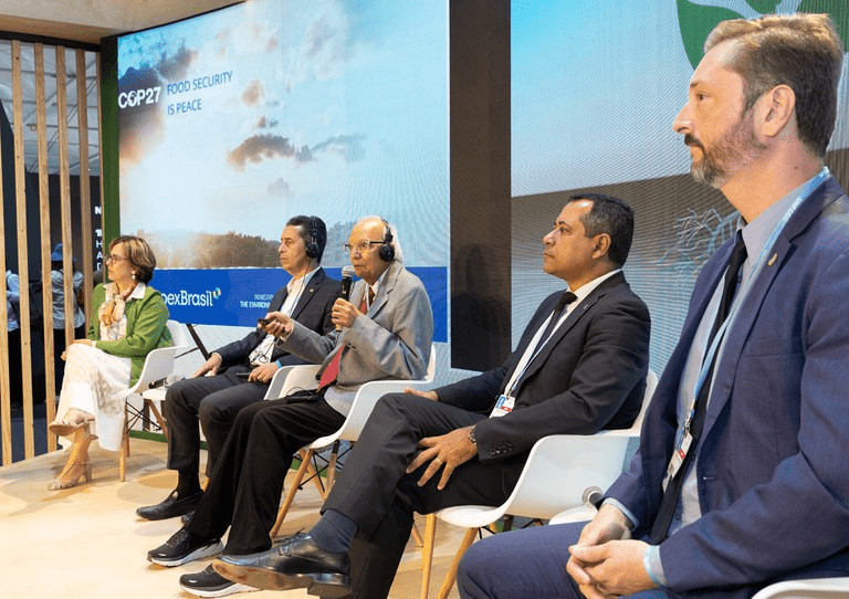 Imagem: Dr. Rattan Lal (ao meio) na COP27. Foto: Daniela Luquini.